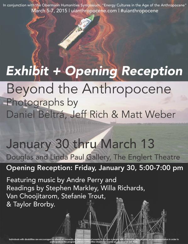 Fellow Fracture editor Taylor Brorby and I will be joining other artists for Beyond the Anthropocene, an exhibit and opening reception exploring “the illusory boundary between what is ‘natural’ and what is ‘man-made.'” Showcasing the work of three photographers, one musician, and five writers, the exhibit is part of the University of Iowa’s Obermann Humanities Symposium, “Energy Cultures in the Age of the Anthropocene,” March 5-7, 2015.